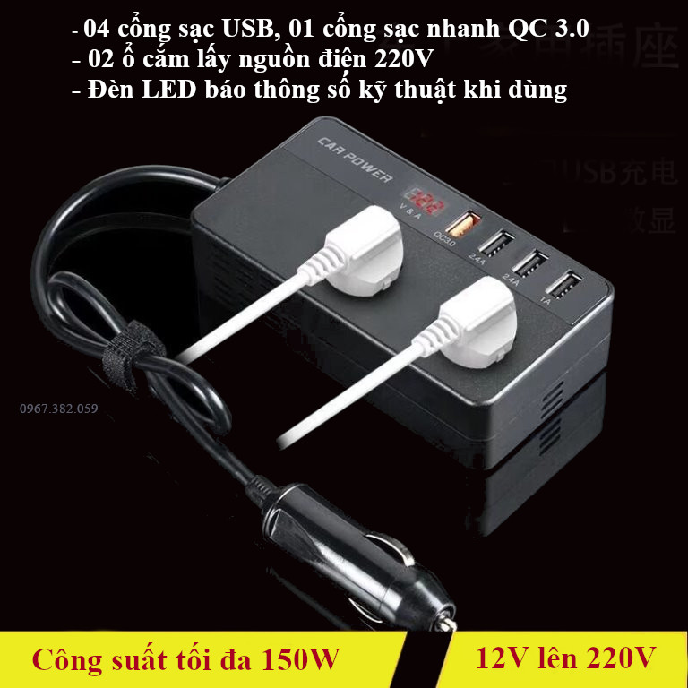 - Công suất đầu ra: 150W. Vô cùng nhỏ gọn, tiện dụng, tuyệt đối an toàn trên xe hơi (Có video minh họa)
