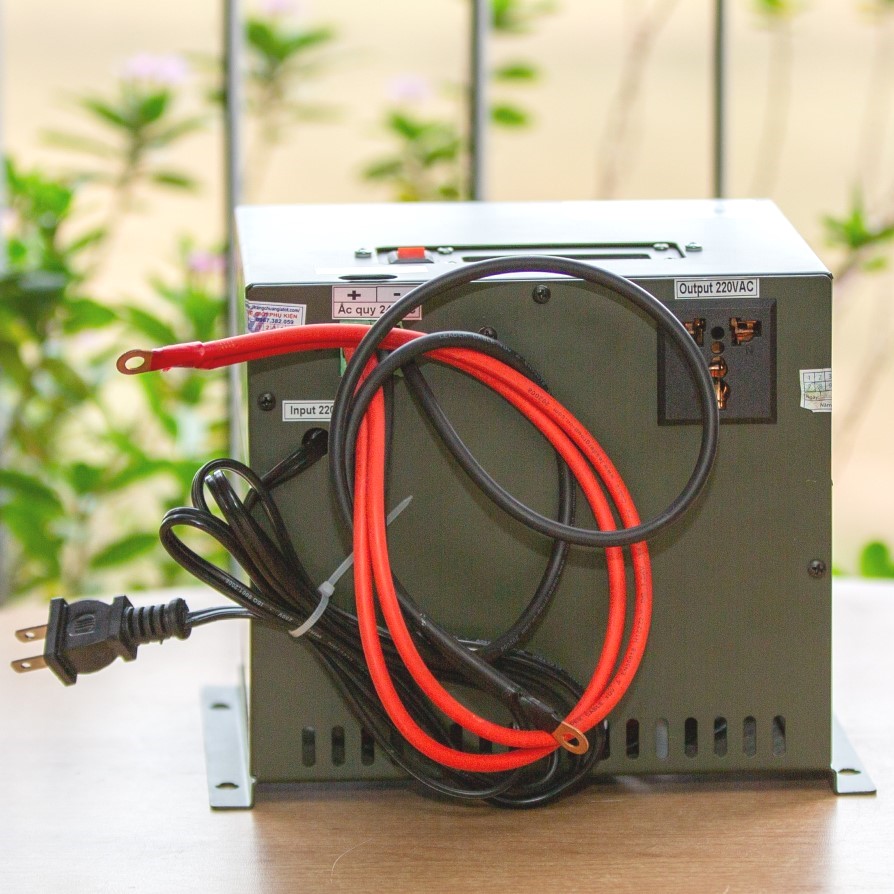 - Cơ chế hoạt động của máy: Khi có điện lưới sẽ lấy điện lưới cấp cho tải và nạp cho bình ắc quy. Khi mất điện lưới sẽ tự động ngắt điện lưới và lấy điện bình ắc quy ra điện 220V cấp cho tải (Có video minh họa)