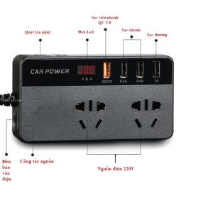 - 02 ổ cắm 220V lấy cấp điện ra dùng cho các thiết bị trên ô tô: Quạt điện, máy tính, laptop, máy hút sữa, loa đài nghe nhạc, máy lọc không khí, sạc dự phòng, cảm biến lốp, camera hành trình…