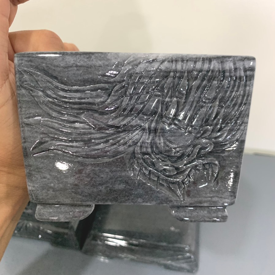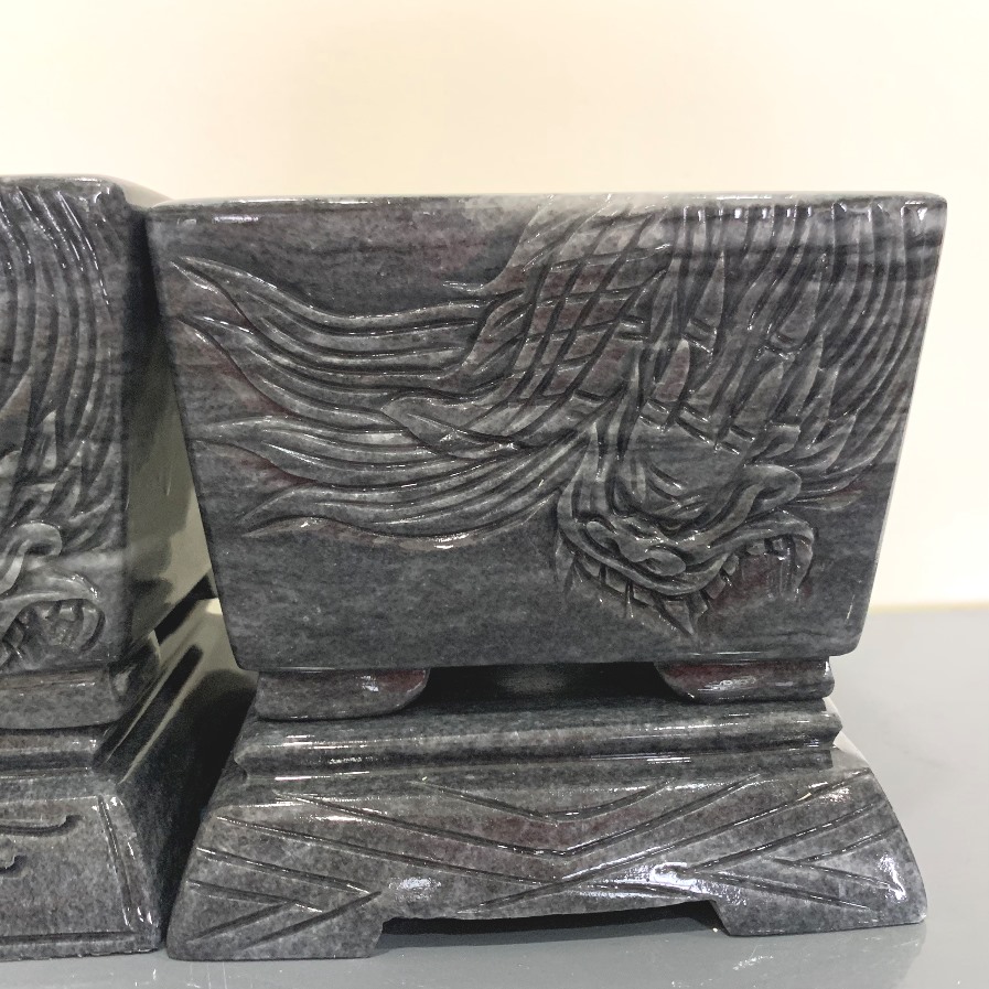 - Chậu đá đục chạm khắc thủ công bằng tay nguyên khối kỹ càng, chi tiết, sắc nét, không có lỗi. Hoa văn Rồng Phượng đục nổi