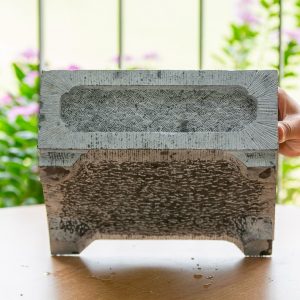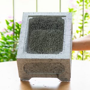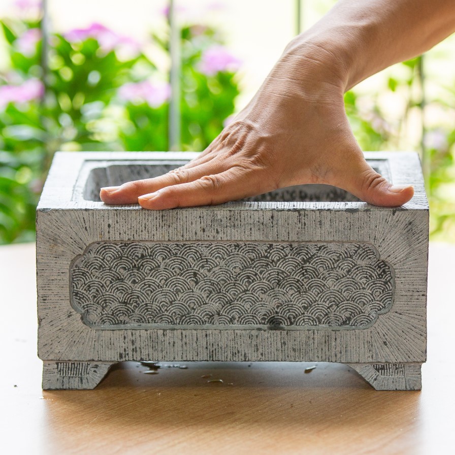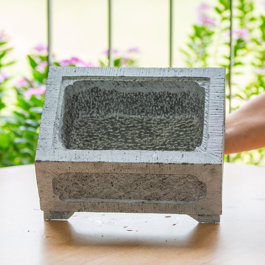 - Kiểu dáng: Chậu chữ nhật có chân liền khối, đục Vẩy Rồng 4 mặt