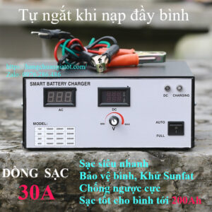 - Dòng sạc tối đa NHANH: 30Ample/ giờ (Ví dụ: bình có dung lượng 200Ample nếu kiệt bình thì sạc 6 – 7 giờ là đầy bình)