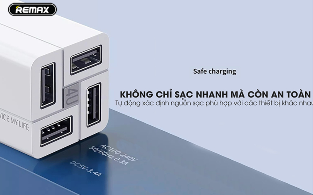 - Đây là sản phẩm cao cấp chính hãng Remax, chuẩn sạc nhanh có 04 cổng ra sạc cùng lúc cho nhiều điện thoại. Đồng thời dùng rất tốt để sạc cho máy tính bảng, Ipad và các thiết bị điện khác.